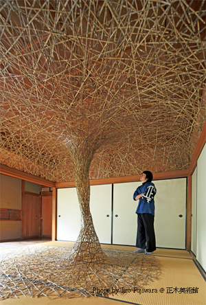 Quatrième sculpture végétale monumentale élaborée par Tanabe Shouchiku, cette installation est réalisée à partir de 8000 tiges de bambou calibrées. Symbole de bon augure tout comme le pin ou le prunier, le bambou est une incarnation de l’esthétique japonaise. Il se dresse haut et droit, ses feuilles produisant dans le vent un son naturel et apaisant. L’artiste emploie exclusivement des tiges de bambou tigré (torachiku) ou de bambou noir, constamment réutilisées. Ces bambous ne poussent qu’en un endroit du Japon, où le sol leur confère ces tigrures uniques. Ces brins de torachiku parlent ainsi de l’enracinement en un lieu mais aussi de la virtualité inépuisable de leur déplacement dans le temps et dans l’espace.