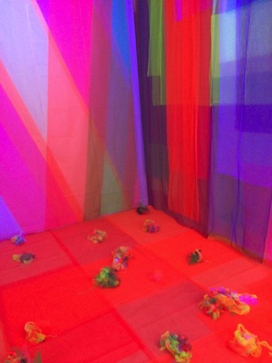 Différentes couches de tulle enveloppent l’architecture intérieure du lieu. Le diaphane des textiles s’associe à la fluorescence pour perturber la perception de l’environnement. Les tubes de néon ultraviolet (lumière noire) font réagir les couleurs des tentures et donnent une lumineuse tonicité aux teintes. Ce travail de peintre a été réalisé sans peinture. Les murs perdent leur solidité. Il ne s’agit pas de recouvrir les murs mais, plus prosaïquement, de les vêtir, de faire en sorte qu’ils ne paraissent plus nus.