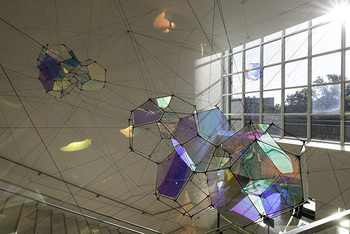 Tomás Saraceno , artiste de renommée internationale et architecte de formation, utilise des panneaux irisés, des toiles d’araignées et des orbes gonflables pour réaliser trois sculptures fascinantes. La pièce maîtresse de l’exposition, Entangled Orbits, est faite de groupes de modules à panneaux irisés maintenus en place par des cordes rappelant une toile d’araignée. Apparaissant un peu à la manière de bulles, ces modules sphériques évoquent les plans visionnaires de l’artiste pour les « villes en nuage », qui se inspirent de formes d’origine naturelle et pourraient constituer un environnement propice à la future habitation humaine. De même, la toile d’araignée complexe de cordes fait référence à une structure naturelle qui englobe les qualités de force, de beauté et de souplesse.