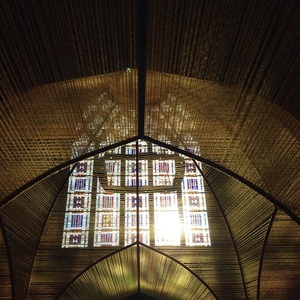 L’artiste Olivier Roller expose une « cathédrale de fil » dans l’enceinte de la chapelle du château d’Angers, polychrome et diaphane. Cette construction évoquant l’architecture traditionnelle des cathédrales médiévales, en croix latine, avec des arcs brisés et une croisée d’ogive, s’appuie sur une structure métallique dans laquelle s’entrelacent des fils de laine.
