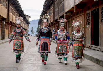 Several ethnic minorities live in the mountainous southwest region of China, in the province of Guizhou. The Miao are one of the largest groups (9 million people) and live throughout this area along with other minority groups like the Dong (3 million). Over the centuries the Miao migrated throughout the southern part of China and in all of the different villages where they settled they developed their own form of dress. There are some 175 to 200 different kinds of traditional Miao costumes! The groups are often named on the basis of their clothing. For example, there are the Long-horn Miao, the Long-skirt Miao, the Red-embroidery Miao and the Tin- embroidery Miao. While the Miao usually live in the mountains, the Dong can be found near the rivers. They are renowned for their beautiful wooden bridges and towers.