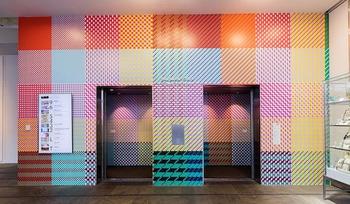 Installation qui recouvre de motifs textiles colorés le hall, dans le cadre du programme 1ST SITE.
