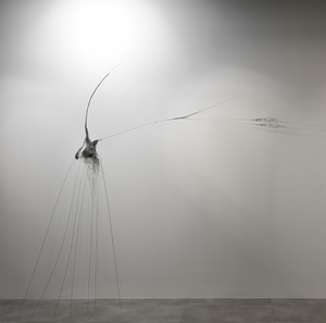 Gaëlle Chotard investit le Drawing Lab. L’artiste, qui expérimente tous les possibles du dessin, l’invente aussi en 3D dans l’espace. Après avoir couché ses esquisses et lavis sur le papier, elle utilise l’inframince des cordes à piano, de gaines métalliques détournées de leur fonction initiale, qu’elle tend, tisse, troue, crochète et suspend.