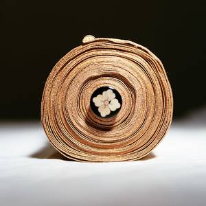 Elle rend hommage aux fameux rouleaux recréés par Maître Itarô Yamaguchi, tisseur de Kyoto, d’après le Dit du Genji, monument de la littérature japonaise.