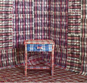 This exhibition is an autobiographical reflection of the Nobukho Nqaba‘s childhood home and upbringing. It highlights the precariousness of daily life within an informal settlement in Grabouw. Many people migrated to this community with bundled up ambitions and modest possessions all packed tightly into checkered plastic bags, commonly known as China bags. They moved in hope for better work; jobs that would eventually require them to dress in sweat-stained blue overalls.