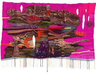 Friedman creates large, painterly weavings that ooze, sag, pinch, and dangle in vibrant shades of magenta, vermilion, fluorescent yellow, and cobalt blue. Her compositions, full of seemingly dissonant yet pleasurable colors and patterns, draw upon viewers’ feelings of discordance to provoke a visceral response.
