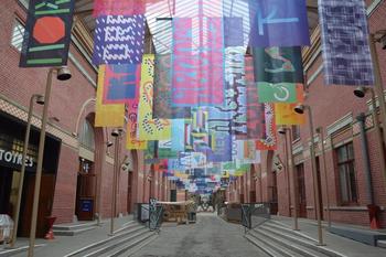 Avec Tisser-Métisser, il faut regarder en l’air. Tout autour du bâtiment et de sa cour intérieure, le collectif a installé une centaine de mots sur des kakémonos. Réalisées cet été avec des jeunes, des habitant·es du quartier mais aussi des graffeur·ses et des typographes, ces grandes bandes de tissu coloré sont suspendues pour offrir un spectacle poétique et historique.