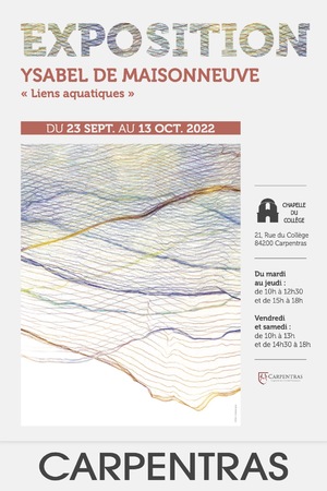 “Une exposition des travaux d'Ysabel de Maisonneuve, tel un parcours au fil de l’eau à travers les lignes colorées du shibori, techniques japonaises de teinture de textiles. Ces savoir-faire font échos à cette quête du geste et ces parts de mystères enfouis dans nos mémoires rendant visible l’énergie qui nous traverse“