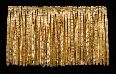 C’est l’époque aussi où elle découvre l’or qui devient son empreinte et sa marque de reconnaissance. Elle utilise également des fibres comme le luffa, le gaïac (plantes diverses) et entrelace des bandes pré-tissées préalablement enduites de plâtre, de gesso, de pigments puis peintes d’or et d’argent. Ce qu’elle donne à voir, là, et qu’elle sublime en pleine lumière, ce sont les richesses enfouies de l’Amérique du sud, son histoire, ses légendes et ses fantasmes. Comme dans « Alquimia XIX » en 1984.