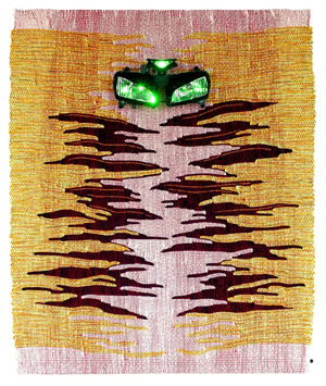 C’est aux côtés de Simone Prouvé qu'elle effectue une formation de tissage de basse lisse. Une transmission artisanale qui lui permet de reconnecter avec le savoir-faire ancestral et familial du tissage bolivien. Dès ses premiers tissages, Kenia décide d’y incorporer de la lumière, sous différentes formes. Tissée, brodée ou encore suspendue au milieu des pièces, cette lumière vient traverser les compositions et leur imposer un rythme cali(carto)graphique. Des phares de voitures, de scooters ou de camions donnent à certaines pièces un regard perçant et hypnotisant.