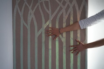 Hybrides, les créations textiles multimedia de Chloé Bensahel sont également « cyborg », pour citer la philosophe Donna Haraway et sa lecture féministe du potentiel émancipateur des technologies. L’artiste mêle techniques traditionnelles de tissage français et nouvelles technologies, grâce auxquelles elle programme la capacité de ces tapisseries à chanter. Au contact du toucher des visiteurs, elles s’activent, s’illuminent et entonnent ici un chant byzantin. Le chant et le toucher réveillent la mélancolie et la gloire de ces vécus transplantés, et nous invitent à plus d’écoute, d’empathie et de reconnaissance à l’égard de ce que nous percevons péjorativement comme Autre car trop étranger à nous-mêmes.