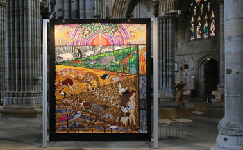 L’artiste du Devon Jacqui Parkinson s’est plongée dans les premières pages du livre de la Genèse de l’Ancien Testament pour imaginer son installation textile actuelle « Threads through Creation ». Douze immenses panneaux racontent l’histoire de la création à travers des appliqués, des œuvres effilochées, des broderies et des courtepointes. Il s’agit de l’un des plus grands projets d’art textile d’un seul artiste au monde.